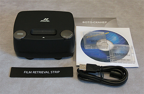 В комплект входят: устройство, кабель USB-miniUSB, рамка для рулонной пленки, рамка для отдельных кадров (как правило, под слайды), диск с программным обеспечением, инструкция, пластиковая полоска для извлечения коротких кусков пленки.