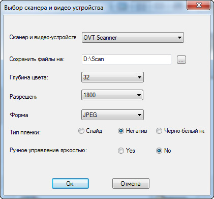 Тут самое главное - можно выбрать слайд (позитивное изображение на слайде - как правило, цветном), цветной негатив, черно-белый негатив. Разрешение там предлагается 1800 или 3600 - это соответствует конечному кадру в 2596×1680 или 5184×3360 пикселов (примерно 9 или 12 мегапикселов).