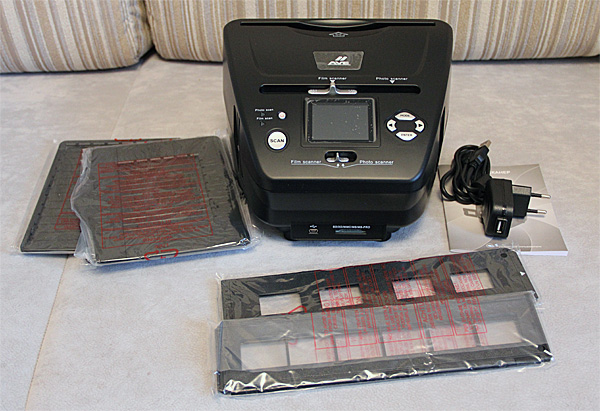В комплект входят: сканер, кабель USB-miniUSB, адаптер питания, рамки для негативов и слайдов, рамки для фотографий 9×13, 10×15 и 13×18 см.