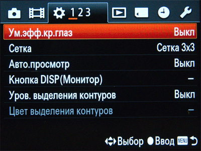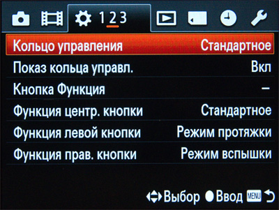 Традиционная для аппаратов Sony кнопка, на которую можно навесить до семи нужных вам функций. Пять функций установлены по умолчанию, но вы их можете в любой момент поменять, а также добавить еще пару. По умолчанию выставлены: компенсация экспозиции, ISO, баланс белого, DRO-HDR, специальный эффект.