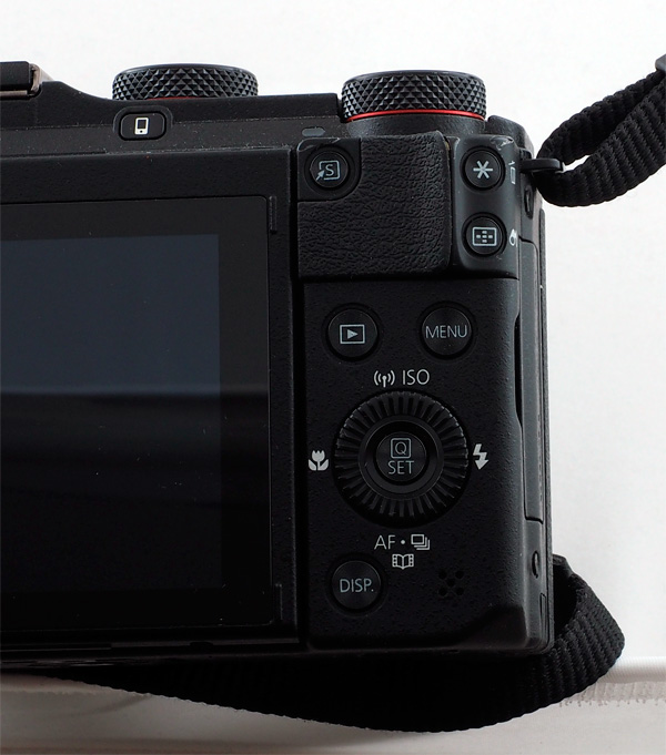 Кнопка беспроводного подключения внешних устройств (смартфоны, планшеты, компьютеры). Кнопка быстрого доступа, кнопка режима настройки экспозиции, кнопка настройки рамки фокусировки, воспроизведение, меню, четырехпозиционное зубчатое колесо (ISO, макросъемка, вспышка, режим фокусировки) с центральной кнопкой настроек параметров, кнопка DISP смены режима отображения информации.