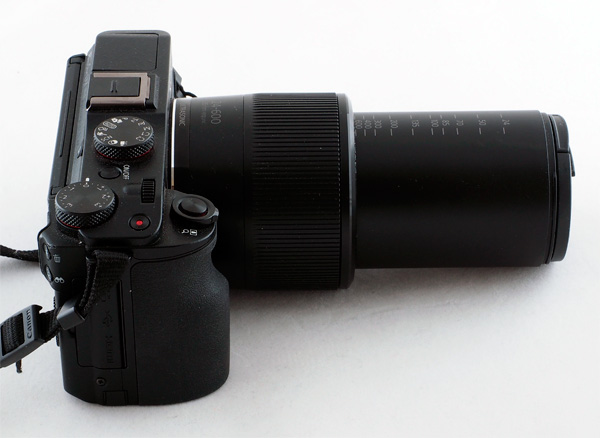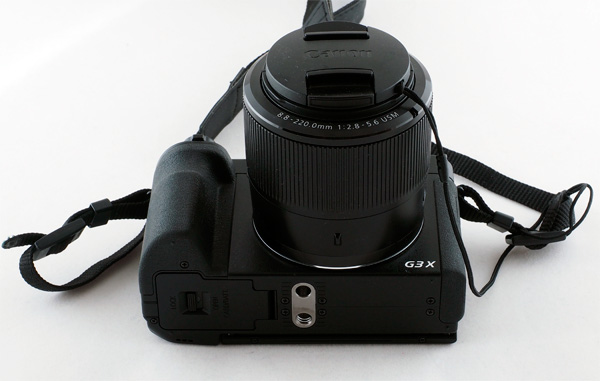 Более или менее традиционное исполнение для серии G. Однако выступ под хват справа заметно удобнее, чем у модели G1 X. Почему на несъемном объективе не сделали шторку, как на G1 X, не знаю, но зато крышку объектива заботливо привязали веревочкой, чтобы не потерялась.