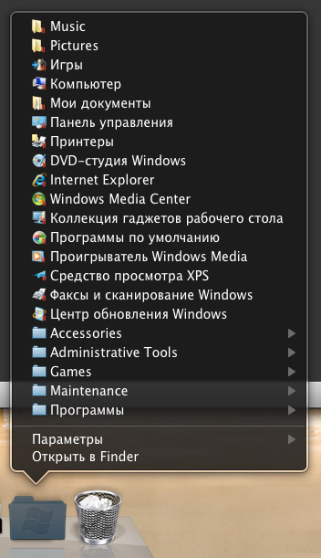 Второй вариант - еще более полная интеграция Windows в OS X. В этом случае в док-панели появляется меню программ, с помощью которых в обычных окнах OS X можно запускать приложения Windows, также  сверху в области уведомлений появляется ссылка на привычную кнопку "Пуск", с помощью которой также можно запускать приложения.