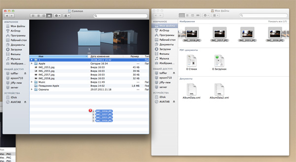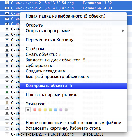 Однако, в отличие от Explorer, в меню нет пункта "Вырезать", так что если вам нужно переместить файлы в какую-то конкретную папку, то их сначала придется скопировать, а потом исходные файлы удалить. Впрочем, это легко решается через меню: нужно сначала с помощью меню скопировать файл(ы), а затем в папке назначения нажать правую кнопку мыши, причем с нажатым Alt - тогда вместо "Вставить" появится "Переместить объект сюда". Также когда файлы перетаскиваются мышью с помощью Drag&Drop, то если при этом нажать клавишу Cmd, то они будут переноситься, а не копироваться.
