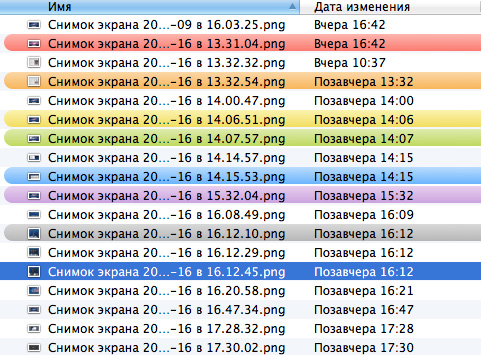Крайне полезная возможность, совершенно отсутствующая в Explorer. Вы можете каждому файлу или группе файлов назначить одну из семи цветовых этикеток. При этом этикетки будут выглядеть следующим образом.