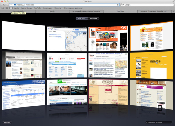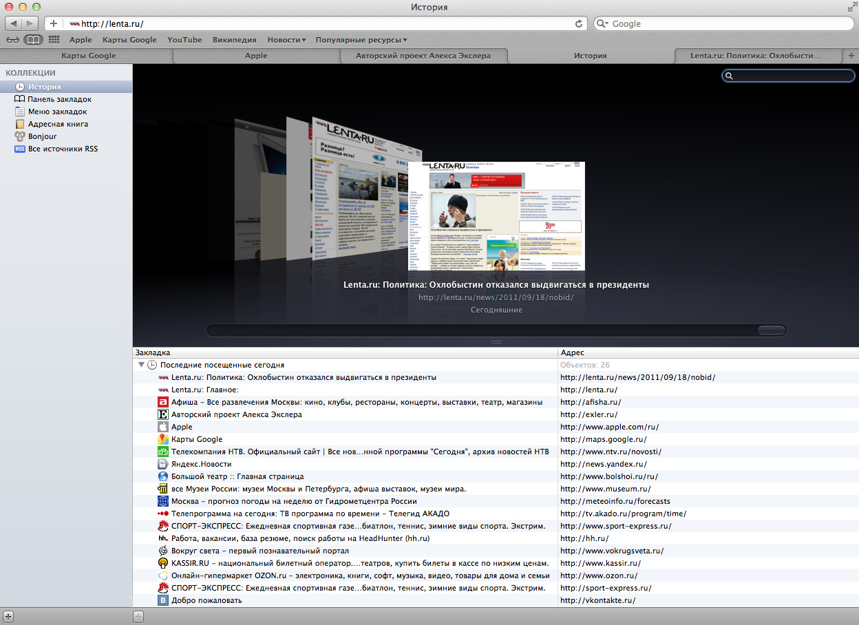 В разделе коллекции в удобном режиме предпросмотра (CoverFlow) выводятся всякие сущности: история адресов, панель закладок, адресная книга, источники RSS и так далее.