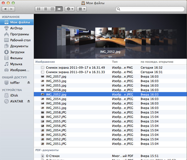 В Finder, разумеется, можно менять представления файлов: значки, список, таблица, предпросмотр (CoverFlow).