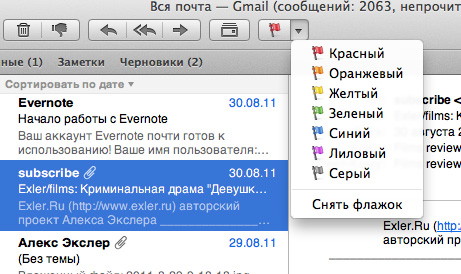 Письма могут помечаться цветными флажками - например, по степени важности. По флажкам есть отдельный отбор - как по всем, помеченным флажками письмам, так и по конкретным флажкам.