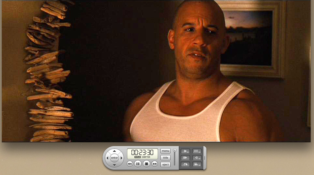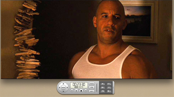 DVD воспроизводится с помощью программы-плеера. В полноэкранном режиме блок управления автоматически скрывается и появляется в самом низу экрана при щелчке мышью. В оконном режиме блок управления висит отдельно и его можно перемещать в любое место экрана.