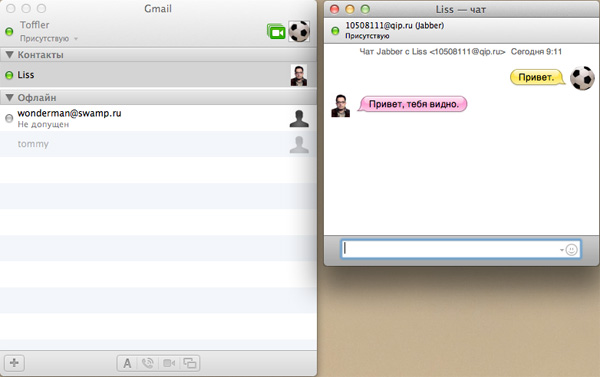 В OS X есть собственная служба мгновенных сообщений - iChat. Возможности там следующие: обмен текстовыми сообщениями, разговоры голосом, видеочат, удаленный доступ к рабочему столу, демонстрация документов (iChat Theater). Поддерживает учетные записи следующих сервисов: AIM, MobileMe (Mac.com), Jabber, Google Talk, Bonjour. Есть также расширениях, позволяющие использовать и другие протоколы - например, ICQ (расширение Chax).
