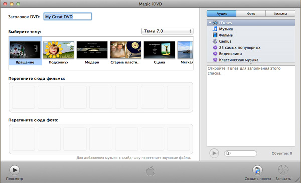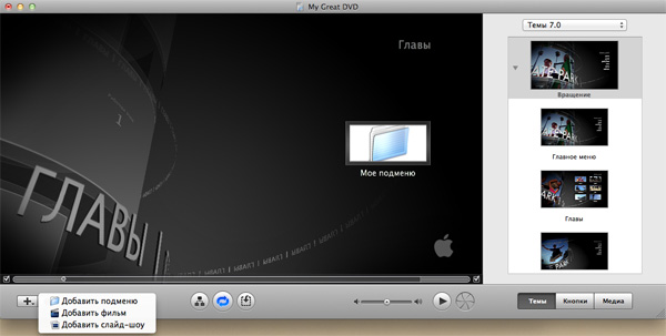 iDVD позволяет создавать фильмы с меню, также импортировать снятое на камеру домашнее видео прямо в DVD.