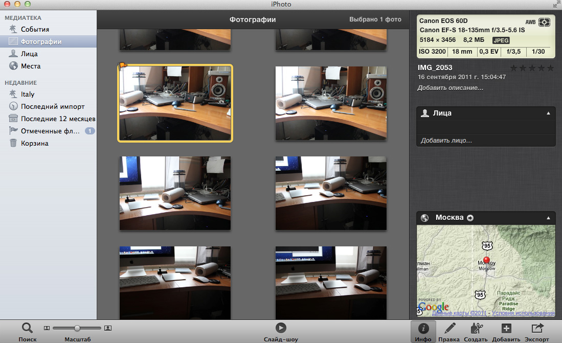 Базовая программа просмотра изображений тут более продвинутая, чем в Windows. Правда, я тут не встретил сортировки, например, по размеру файлов, но тут есть другие возможности - вообще говоря, более интересные. iPhoto умеет отбирать фотографии по именам, событиям (папкам), лицам, местам и отмеченные флажком.