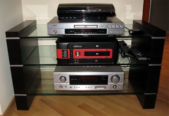 В данном же случае эти проблемы пока не волнуют, поэтому компьютер просто ставится в стойку, через переходник подключается к HDMI-кабелю проектора, проводочком S/PDIF соединяется с ресивером, ну и вперед - смотреть фильмы в высоком разрешении.