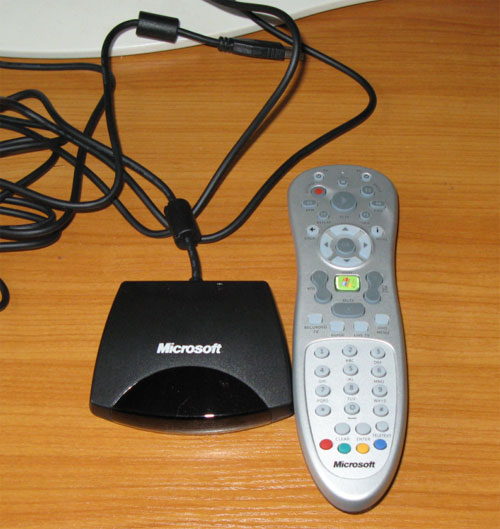 Следующий вопрос, который нужно было решить, - это пульт управления. Понятно, что управлять мультимедийным компьютером мышью и "клавой" - совершенно неинтересно. Поэтому нужен был какой-нибудь пульт. У меня со времен операционной системы Windows Media Center (это на базе XP был такой активно рекламируемый, но, по-моему, совершенно провалившийся проект) остался комплект: пульт и IrDA-блок с проводом: