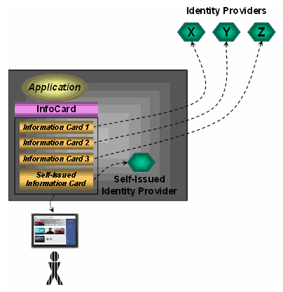 В технологии CardSpace также заложена возможность прямой работы пользователя с сервисом - минуя этап выдачи удостоверения и запроса тикета. В этом случае пользователь сам создает у себя карточки с необходимым набором информации, которые предоставляет по требованию каких-то сервисов. Если в случае с удостоверяющими сайтами Information Card является аналогом паспорта или водительского удостоверения, то в случае прямого обмена пользователя с сервисом Information Card выполняет функцию визитки, содержащей только те данные, которые в данный момент требуются. Ведь какому-то сервису вы готовы/должны раскрывать ваш адрес и телефон (яркий пример - интернет-магазин), а другому - не готовы (например, форум или блог). Для этих случаев создаются разные Information Cards.