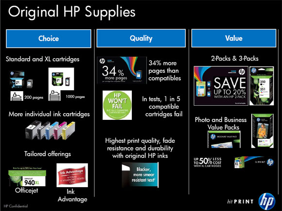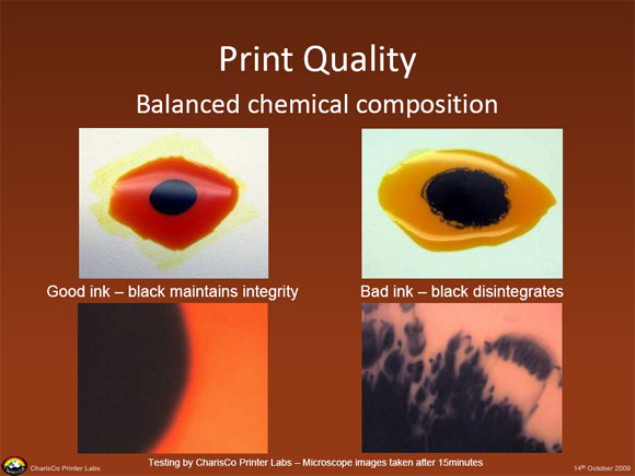 Также показали контрольные отпечатки восьмидесятилетней давности: фотография, сделанная с помощью родных картриджей HP, выглядела как новая. А вот фотография, сделанная с помощью "совместимых" картриджей, почти вся выцвела, и там вместо девочки с персиками был какой-то крокодил с шариками.
