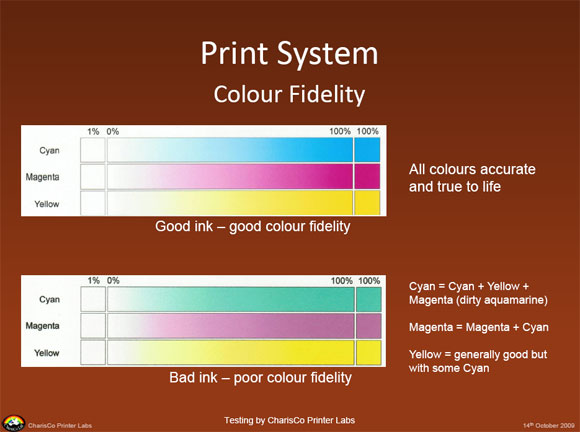В плохих картриджах, как я понял из объяснений Питера, происходит неправильное смешение, в результате чего появляются всякие дикие цвета вроде грязного аквамарина вместо благородного циана.