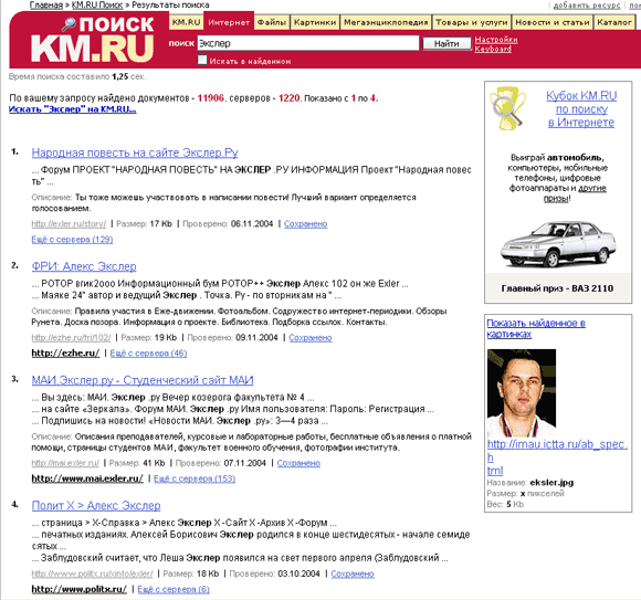 Возникает очень примитивный вопрос: "Ребята, а где, пардон, "Экслер.ру"?" Это не к тому, что я в корень разобиделся, а к вопросу о релевантности. На сайт "Экслер.ру" заходят всего-то 20 000 человек в день. А KM.ru по запросу "Экслер" ссылку на него не дает - по крайней мере, на первых десяти страницах.