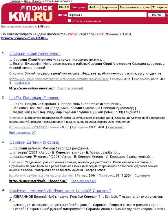 Четвертая - статья от 20 июля 2000 года о писателе Сорокине на каком-то сайте. Он не открывается, поэтому я даже не могу сказать, что это такое.