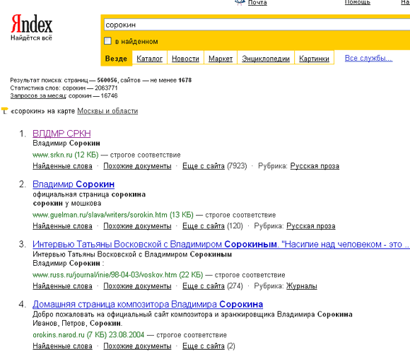 Однако Экслер - широко известен в довольно узких кругах, поэтому объективности ради давайте поищем какого-нибудь действительно культового персонажа. Например, писателя Сорокина. Искать будем просто и тупо - "Сорокин". Проверяя, так сказать, релевантность, потому что понятно, что при наличии сотен и тысяч сорокиных по-настоящему действительно известен всего один - писатель Владимир Сорокин.