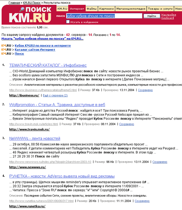 Однако библиотеки - это одно, а поиск - совсем другое. "Нужно быть объективным", - подумал я и решил выяснить, что же такое представляет собой поиск на КМ.ru, раз он (по мнению eHouse) так круто затыкает за пояс сам "Яндекс".