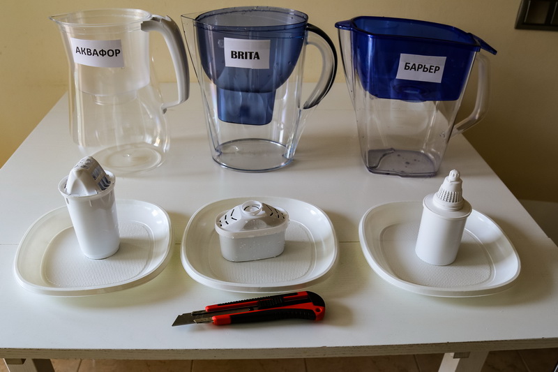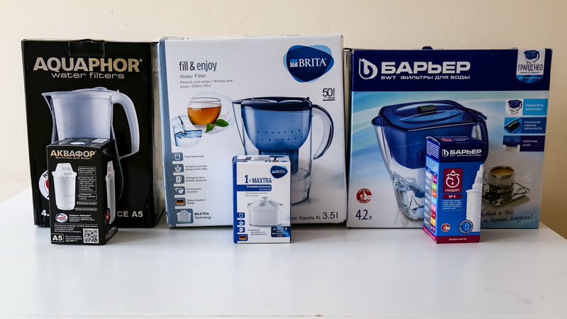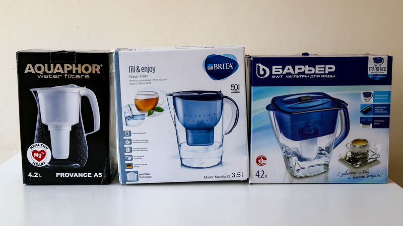 Я решил для изучения взять три основных бренда (химик на Хабре изучал их же), модели мне попались следующие (они друг от друга довольно мало отличаются, да и картриджи в разных моделях, как правило, используются одинаковые): "Барьер Гранд Нео" (~450 рублей), Brita Marella XL (~800 рублей) и "Аквафор Прованс A5" (~500 рублей).