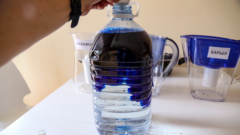 А теперь - сам эксперимент: заливаем воду с красителем в фильтры и смотрим, что оттуда выйдет. Чем чище будет вода, тем лучше работает фильтр.