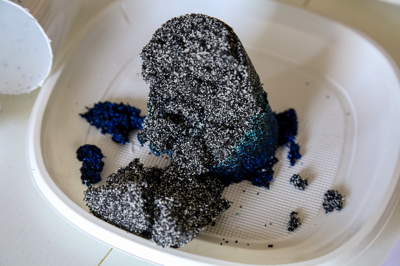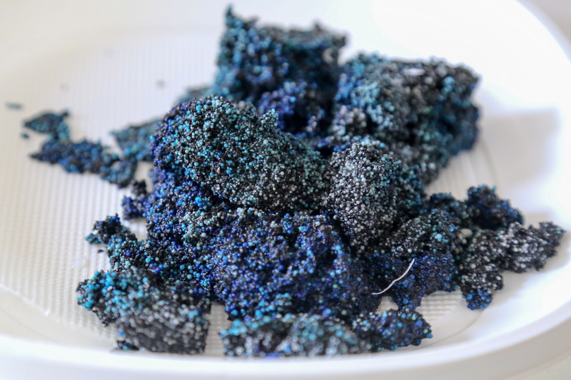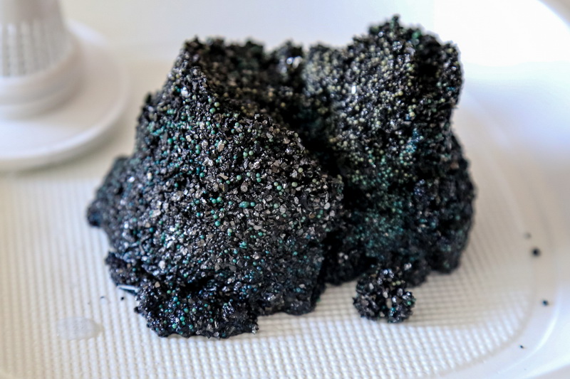 Вблизи. Синеватый оттенок на гранулах - это следы красителя. Черные гранулы - активированный сорбент, серые гранулы - ионообменная смола. Синим красителем здесь в основном прокрасилась верхняя часть картриджа где-то на две трети.
