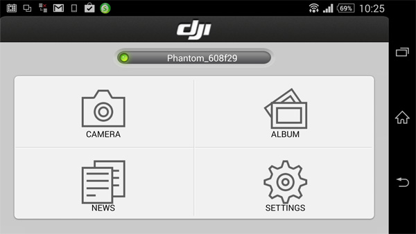 Интерфейс управления коптером со смартфона. Справа различные параметры: Wi-Fi, уровень заряда, наличие SD-карты, количество пойманных спутников (должно быть не менее 6), подключенный трансмиттер, количество оставшихся на карте кадров, съемка фото, съемка видео, настройки.