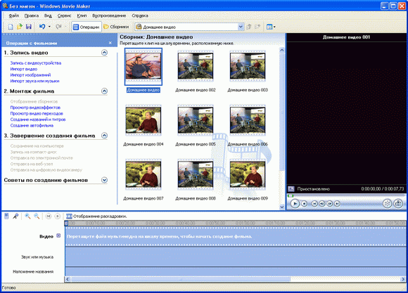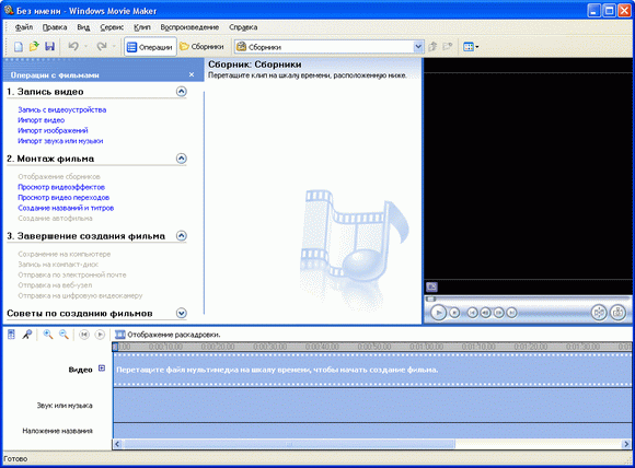 Как видите, здесь все довольно просто и понятно. Слева идет перечисление этапов создания фильма: запись видео, монтаж фильма, завершение создания. В центре – сборник импортированных видеоклипов. Справа – окно предпросмотра, снизу – монтажная панель.