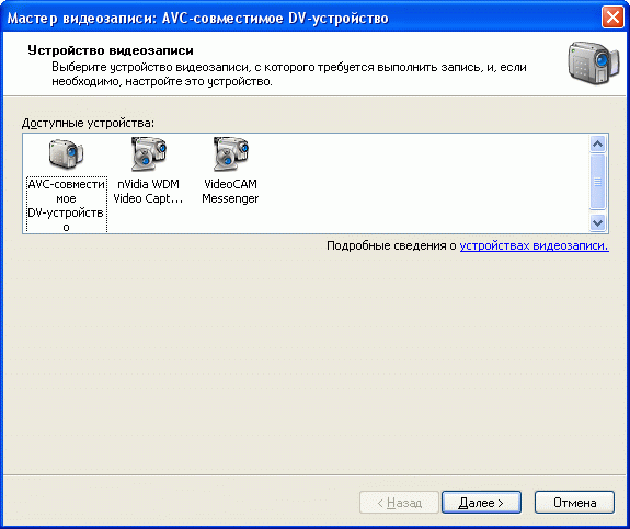 Чтобы начать обработку, нам нужно или напрямую списать видеоролик с внешнего устройства (в данном случае – камеры), или импортировать уже записанный видеофайл. Предположим, что мы хотим напрямую переписать ролик с цифровой камеры. Для этого нажимаем ссылку «Запись с видеоустройства». Перед нами возникает следующее окно: