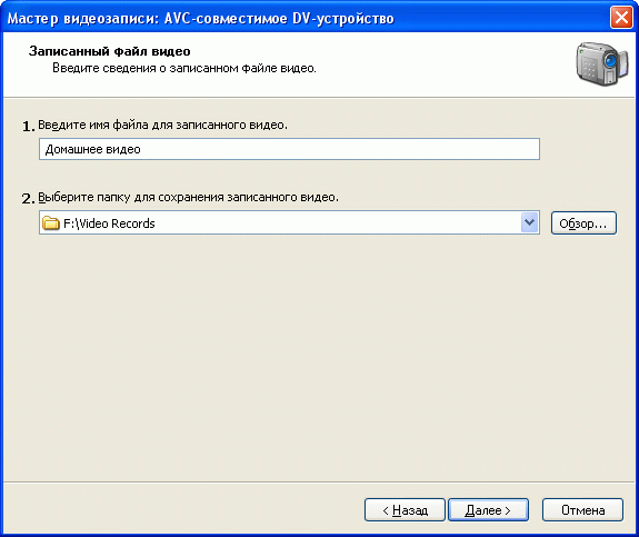 Задание имени видеофайла и папки для его записи