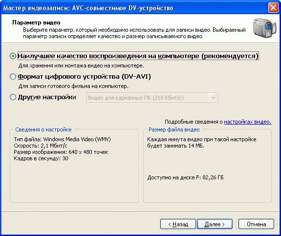 Если вы хотите сохранить ролик в исходном формате без дополнительной компрессии - например, чтобы потом иметь возможность с помощью какой-то программы преобразовать его в  DVD-Video или какой-то другой формат, выбирайте режим DV-AVI, но имейте в виду, что в этом формате сохраненный ролик будет иметь очень большой объем.