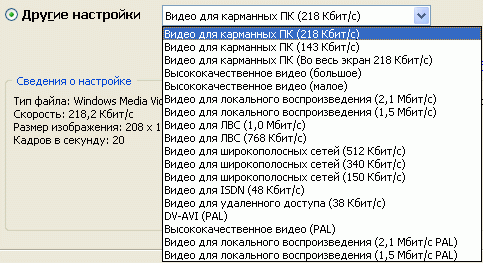 Там представлены различные разрешения: как сильно сжатые, для карманных компьютеров (при этом минута записи занимает не более 1 Мб), так и самые маленькие форматы (например, видео для удаленного доступа), при которых минута может занимать всего 278 Кб.