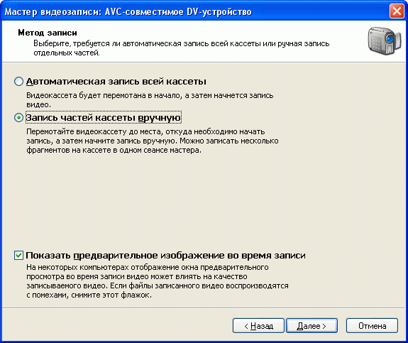 Дело в том, что Windows Movie Maker умеет самостоятельно управлять цифровыми видеокамерами. И если ему дать соответствующую команду, он может сам перемотать кассету на начало, запустить ее с одновременным включением записи и переписать всю кассету на диск. Если вам нужно именно это – выбирайте самый первый пункт (включение или выключение предпросмотра при записи – по вкусу; если вы собираетесь во время переписывания кассеты как-то использовать компьютер, тогда одновременное воспроизведение лучше не включать, потому что оно будет потреблять системные ресурсы). Однако редко когда пользователям бывает нужно переписать сразу всю кассету. Как правило, записи на кассете делятся на разные события, и во имя более удобной обработки лучше выбирать ручной режим записи – и вот тут уже обязательно включайте предварительный просмотр!