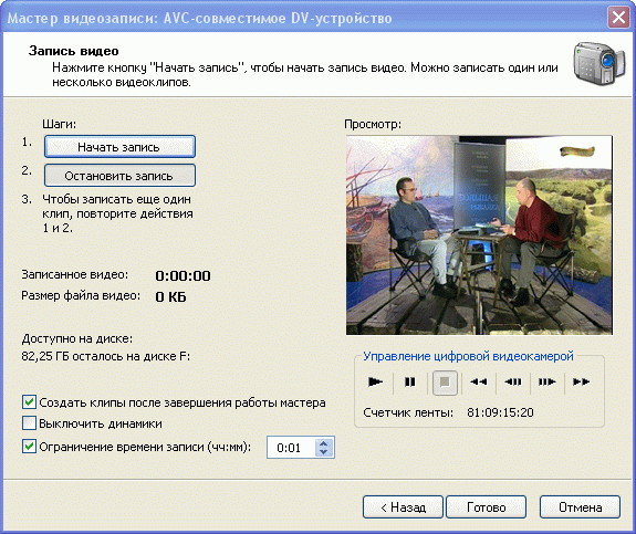 В правой части окна идет предпросмотр записываемого (воспроизводимого) ролика, а также раздел управления цифровой видеокамерой, с помощью которого вы можете производить любые манипуляции с лентой: проматывать ее туда-сюда, запускать, останавливать, делать покадровую перемотку.