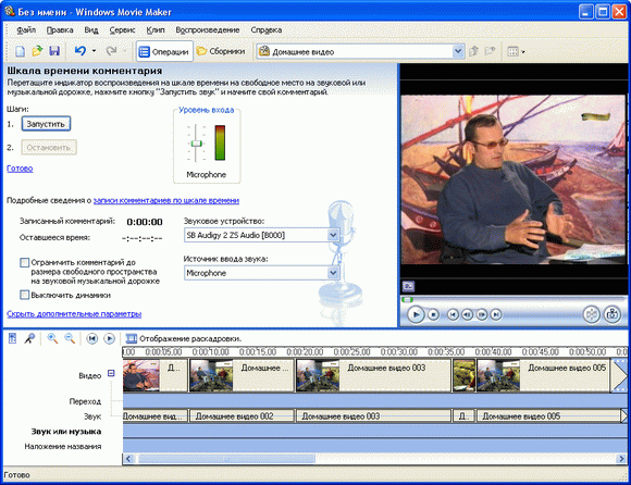 Теперь, когда мы предварительно подготовили раскадровку, можно заняться наложением своих голосовых комментариев. Для этого нужно включить микрофон (в ноутбуках они, как правило, встроенные, в персональных компьютерах их нужно подключать отдельно) и нажать на монтажном столе пиктограмму с изображением микрофона – сверху появится окно аудиозаписи: