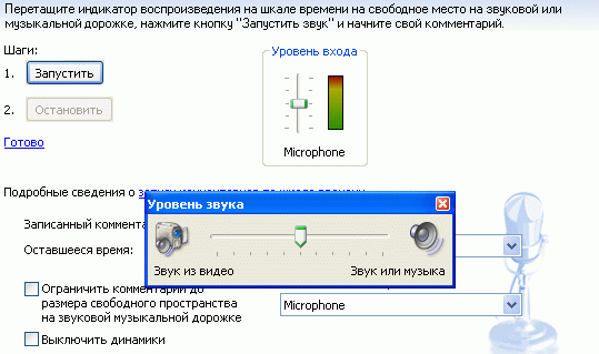 С помощью шкалы уровня входа можно отрегулировать громкость микрофона. Также при нажатии пиктограммы уровня звука на монтажном столе (слева от пиктограммы микрофона) можно установить баланс между уровнем звука клипа и уровнем сопровождения: