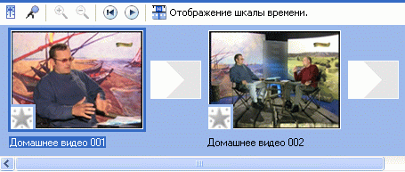 Теперь займемся видеоэффектами. Чтобы перейти к режиму наложения видеоэффектов, нужно щелкнуть на монтажном столе по пиктограмме «Отображение раскадровки». Видеоэффекты могут быть двух типов: эффект воспроизведения самого клипа и эффект перехода от одного клипа к другому. Эффект воспроизведения клипа настраивается с помощью значка со звездочкой, расположенной на клипе, а эффект перехода – на специальном значке между клипами: