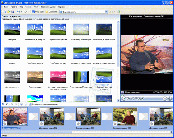 Windows Movie Maker предлагает довольно широкий набор самых разнообразных эффектов воспроизведения: замедление, зернистость, эффект старой пленки, сепия, размытие и так далее. Удобнее всего работать с эффектами воспроизведения следующим образом. Сначала в верхнем меню «Сервис» выберите пункт «Видеоэффекты» – в верхнем окне появится список предлагаемых видеоэффектов с предпросмотром: