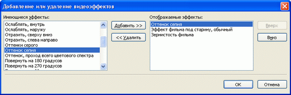Теперь вам остается только взять мышиным курсором нужный видеоэффект и перетащить его на соответствующий видеоклип монтажного стола. Причем эффекты можно как угодно комбинировать друг с другом – например, задать одновременно цвет сепии и эффект старой пленки.