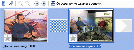 Теперь остается только выбрать нужный эффект и перетащить его мышью на значок соответствующего перехода от клипа к клипу – на значке сразу появится изображение выбранного эффекта. Например, на скриншоте ниже первый переход имеет эффект смены кадра в шахматном порядке, а второй еще не задан.