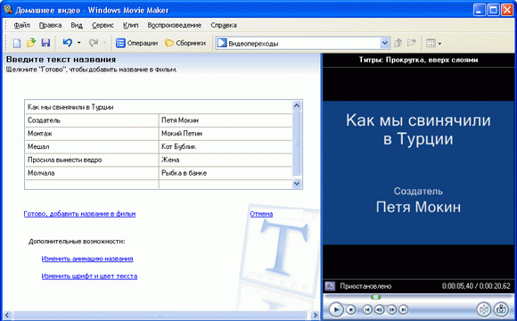 В Windows Movie Maker создать название и титры очень просто. Для этого достаточно в меню «Сервис» выбрать пункт «Название и титры». Перед вами появится список вариантов: