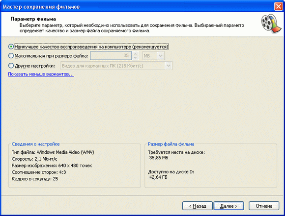 По умолчанию, конечно, нужно выбирать самый первый пункт – наилучшее качество для воспроизведения на компьютере. Фильм будет записан в формате WMV (Windows Media Video), и его можно будет просматривать как с помощью Windows Media Player, так и с помощью любых других плееров, поддерживающих данный формат (например, Nero Show Time). Напомню также, что при этом одна минута фильма будет занимать примерно 15-17 Мб. Наш двухминутный фильм в итоге занял 30 Мб.