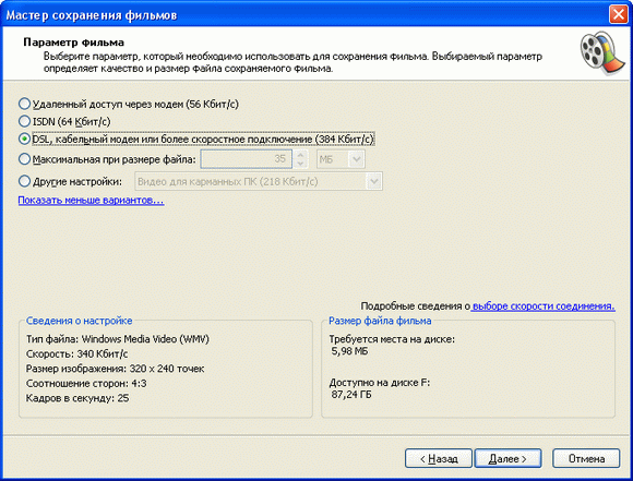 Формат, который уже имеет смысл для передачи через Интернет, – это то, что программа предлагает для DSL или более скоростных подключений – 320х240 точек и 340 Кбит/с. Десятиминутный ролик при этом занимает примерно 25 Мб (вместо 150-170) при вполне пристойном для домашнего видео качестве. Далее вам останется просто каким-то образом выложить его на сайт в Интернете (например, на свою домашнюю страничку) и дать ссылку абоненту.