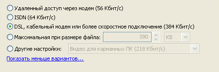 Здесь вас не мучают томительным перечислением всяких интимных параметров видеопотока, в которых вы можете ничего не понимать. Подход, как видите, простой – от вида канала: доступ к Сети через диалап, через слабенькую выделенку, через скоростное подключение. Формат для диалапа выбирать, в общем-то, смысла нет – 160х120 точек и 38 Кбит/с – это не качество вообще. Но диалап для передачи видео через Интернет и не приспособлен, так что, если ваш абонент имеет несчастье выходить в Сеть через телефонное соединение, найдите время встретиться с ним лично и передать этот шикарный ролик в отличном качестве на компакт-диске.
