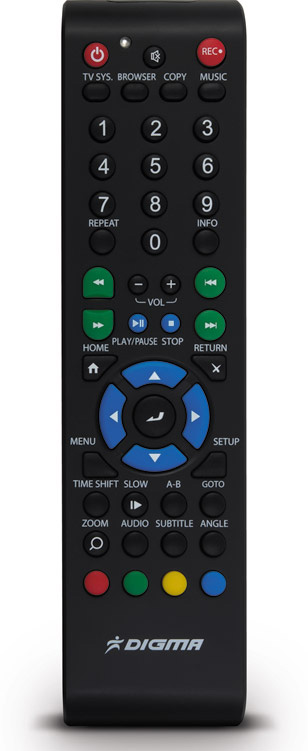 Расположение клавиш вроде более или менее традиционное, кнопки не слишком удобные, однако разработчик пульта решил продемонстрировать нестандартное креативное мышление, поэтому наиболее часто нажимаемые кнопки - пуск/пауза и стоп - он сделал такими микроскопическими, что я думаю - он над нами издевается и был подослан конкурентами в Digma специально, чтобы снизить продажи. Решение просто дебильное, как и в случае  микроскопических кнопок регулировки звука.