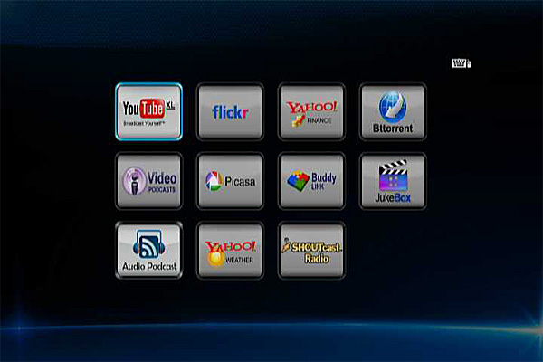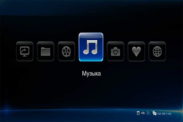 Меню загруженного плеера выполнено слегка в стиле Sony Playstation 3 - горизонтальная полоса крупных пиктограмм: AV-вход (это для записи), файловый менеджер (для быстрого доступа к любым медиафайлам), видео, музыка, фото, избранное, интернет-медиа (сетевые сервисы), браузер, настройки.