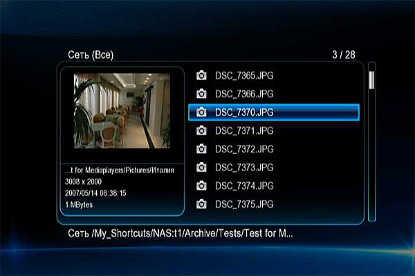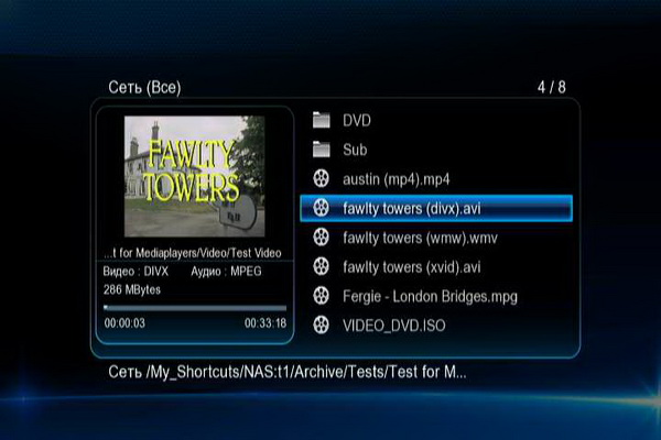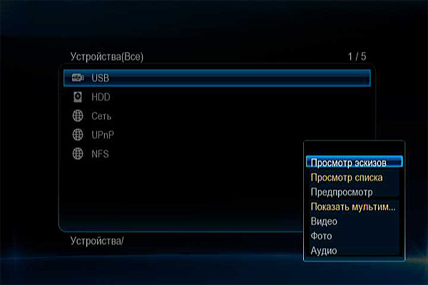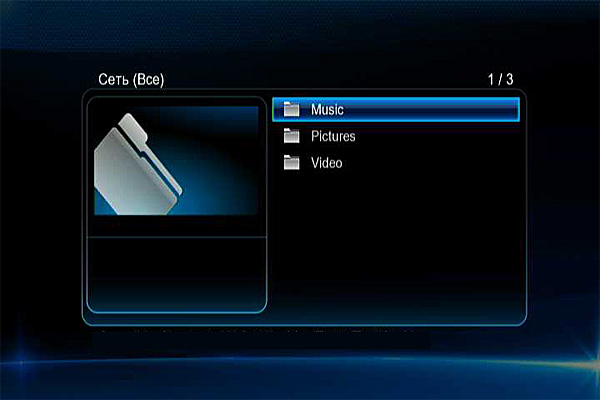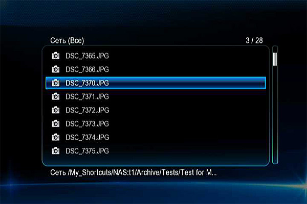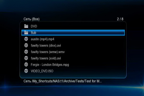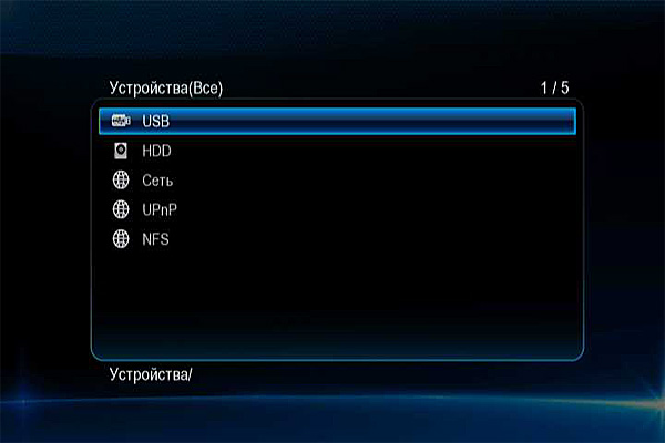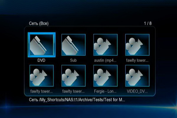 При входе в файловый менеджер плеер демонстрирует все возможные носители (серверы) из реально присутствующих: подключенные USB-устройства, жесткий диск, кард-ридер, сеть (SAMBA), UPnP, NFS, FTP и так далее.