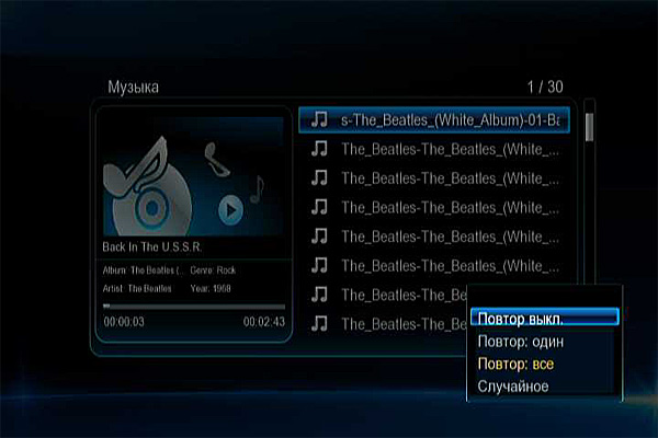 По кнопке меню можно задать режим повтора и режим выбора случайного трека.